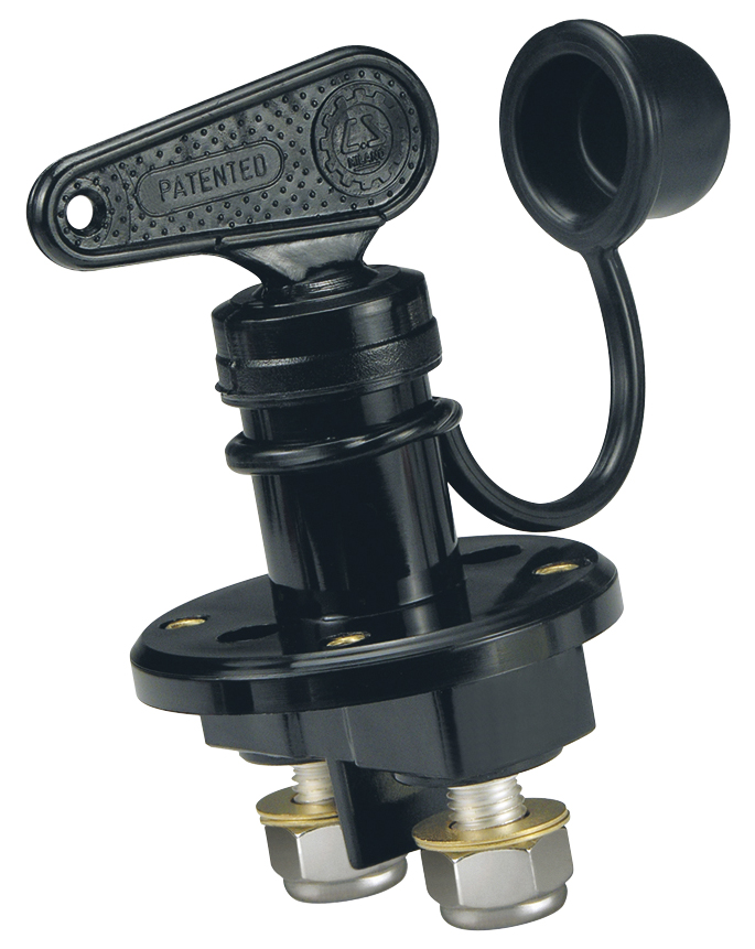 Einpoliger Batterieschalter, mit abziehbarem Schlüssel. 100 Ampere Dauerbetrieb, 2000 Ampere / 3''. Ausführung in Kunststoff, versilberte Kupferkontakte. Befestigung am Flansch Ø mm. 64