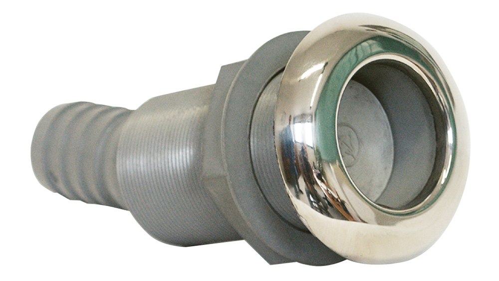 Selbstentleerender Ablauf aus PVC, äußerer sichtbarer Ring aus Edelstahl AISI 316, mit Schlauchanschluss und Rückschlagventil. 15° geneigtes Modell
