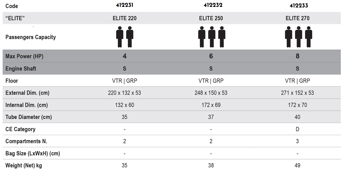 Ausgestattet mit gegengeformtem Glasfaserkörper. Sie sind besonders robust und behalten gleichzeitig ein geringes Gewicht und eine einfache Verstaubarkeit bei. Leicht und schnell bieten die Tender der Elite-Linie ein hohes Maß an Leistung und Handling, perfekt für kleine oder mittlere Boote.