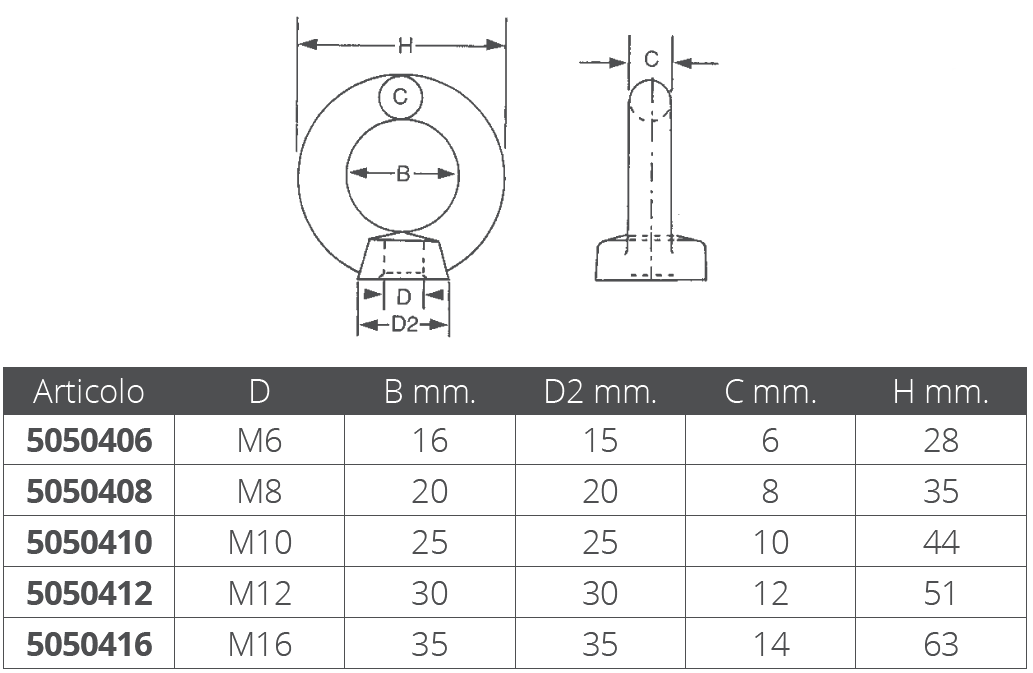 Kreisförmige Augenschraube aus Edelstahl AISI 316 mit Gewindeloch. Abmessungen: D M6, B 16 mm. D2 15mm. C 6 mm. H 28 mm.