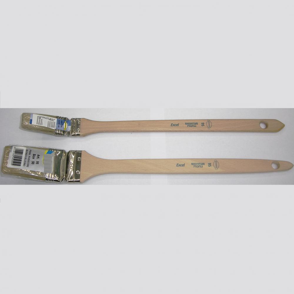 Bürste mit blonden Borsten und Holzgriff, an der Spitze länglich und gebogen, für spezielle Anwendungen in Bereichen mit schwerem Zugang zu Harzen, Gelcoats, Klebstoffen, Grundierungen, Grundierungen und anderen Verwendungszwecken. In verschiedenen Größen erhältlich.