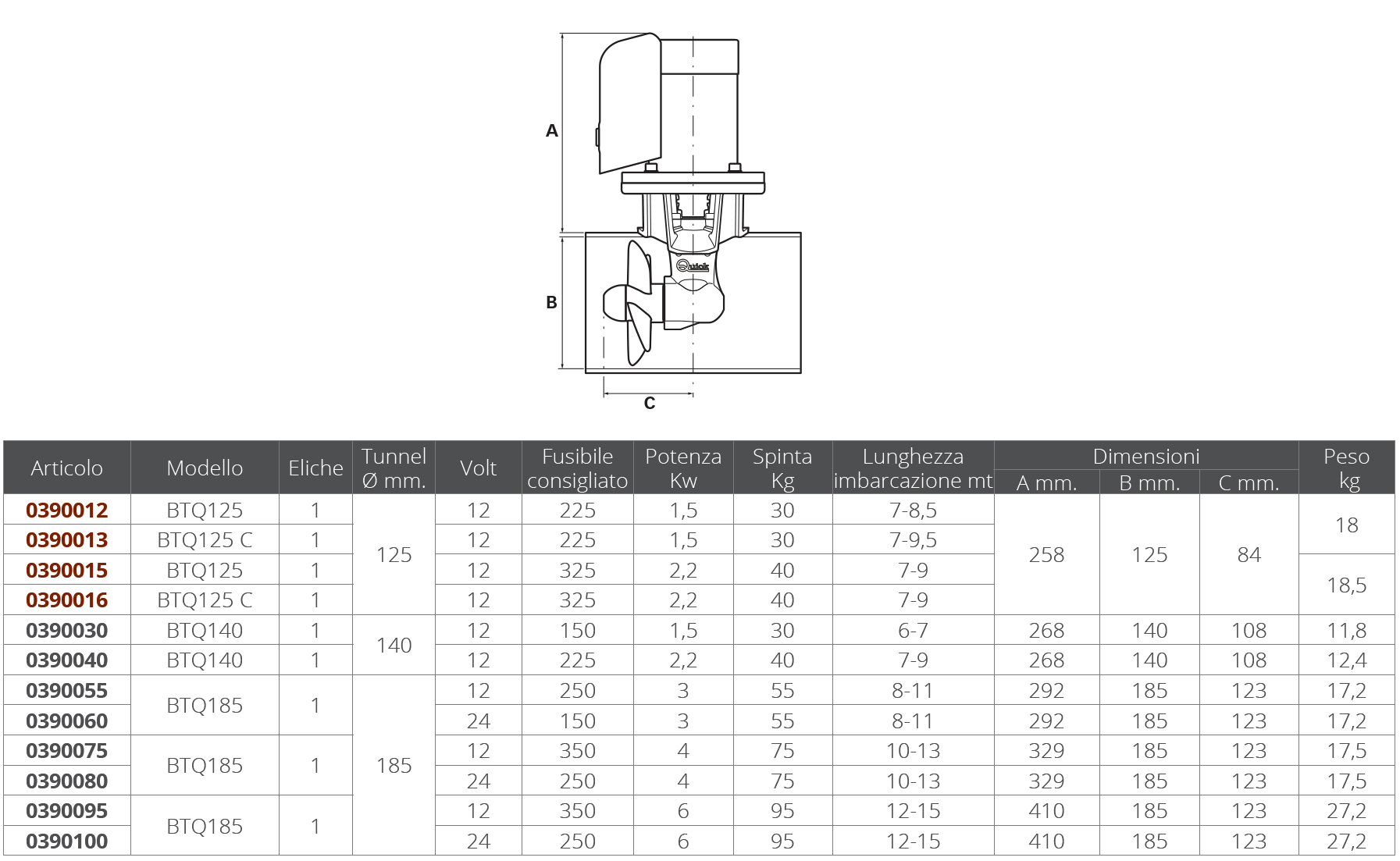 Bugstrahlruder für Boote 12-15 mt., 1 Propeller, Tunnel Ø mm. 185, 12 V, Sicherung 350 A, Leistung 6 kW, Schubkraft 95 kg, Gewicht 27,2 kg.
