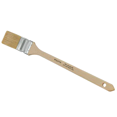 Heizkörperbürste mit Griff aus rohem Holz und Nickelzwinge.