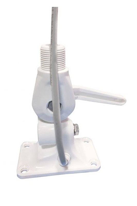 Doppelgelenkter Boden aus verstärktem, UV-beständigem Nylon, mit Hebelarretierung und Kabeldurchführung und Kabeltülle für den Zugang unter Deck im Boden integriert. Standardgewinde 1 ”x14.