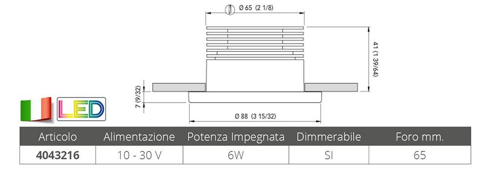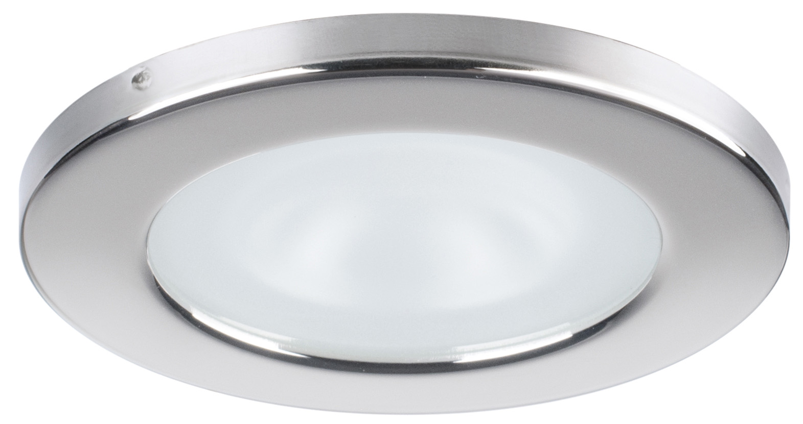 IP65 wasserdichter Strahler aus poliertem Edelstahl AISI 316 mit hoher Helligkeit (280 Lumen), warmweißem Licht, dimmbar, polaritätsempfindlich. Netzteil 10-30V, dim. Ø mm. 88, Loch-Ø Abm.mm. 65, Tiefe 41 mm. Befestigung mit Schrauben