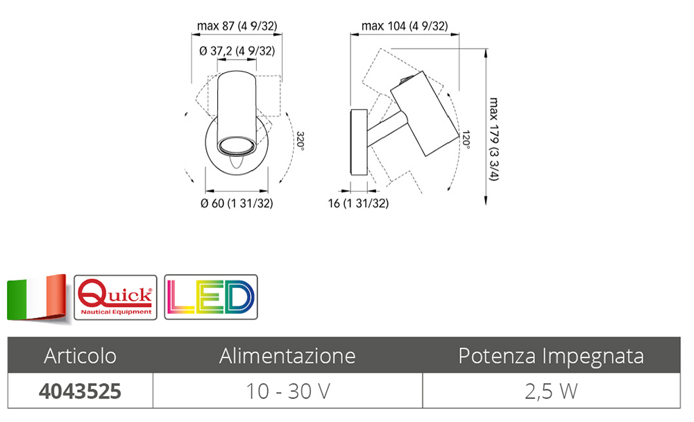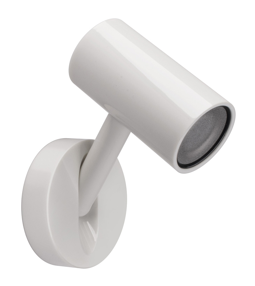Innen verstellbarer Strahler aus weißem Verbundmaterial, ausgestattet mit Schalter. Warmweißes Licht (140 Lumen) Wandbefestigung mit Schrauben. Polaritätsempfindlich. Netzteil 10-30V, dim. mm. 104 x max. 179 x 37