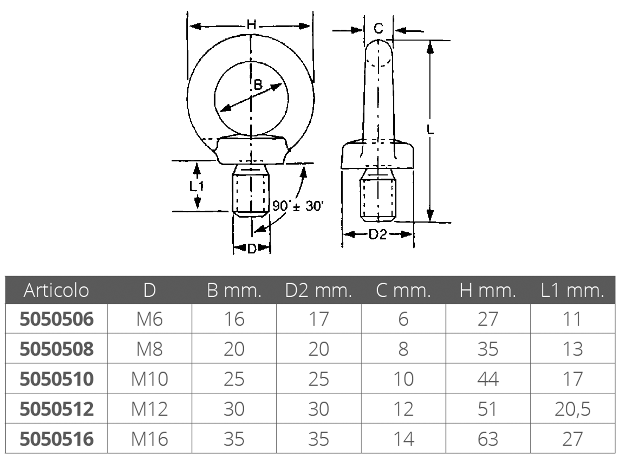 Kreisförmige Augenschraube aus Edelstahl AISI 316 mit Gewindestift. Abmessungen: D M6 B 16mm. D2 17mm. C 6 mm. H 27mm. L1 11mm.