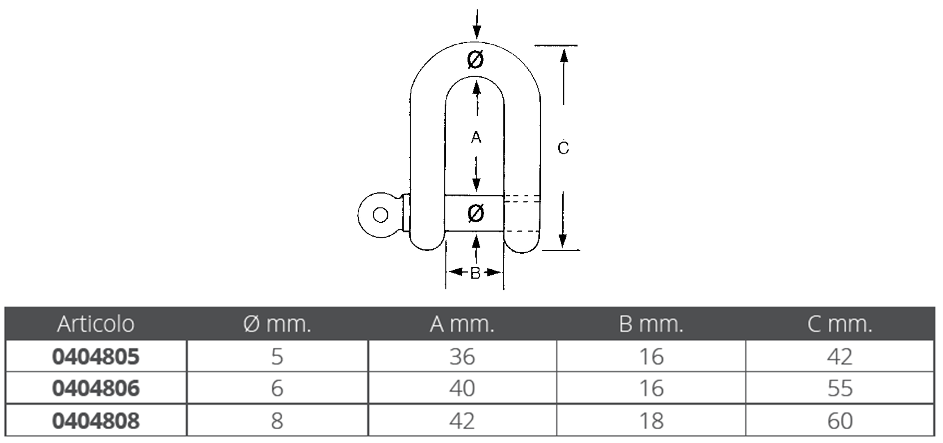 Lange gerade Schäkel aus gepresstem Edelstahlblech. Abmessungen: Ø 5 mm. Bei 36mm. B 16mm. C 42 mm. Bruchlast 1100 kg.