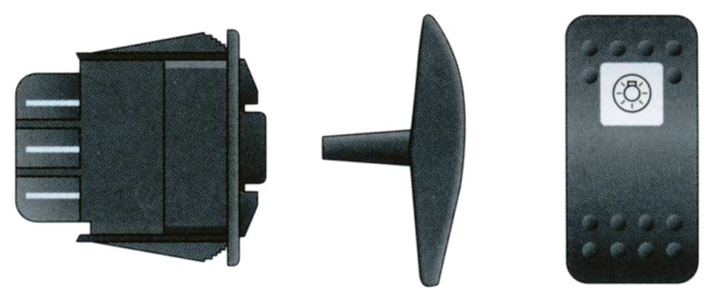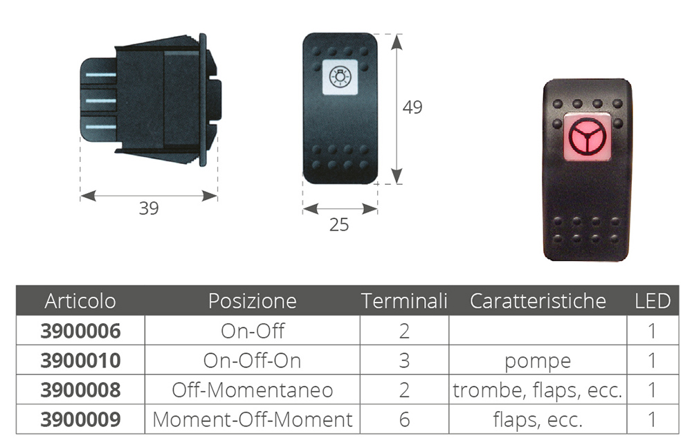 Kippschalter. Ideal für die Montage im Freien, wasserdicht nach IP66, garantiert es eine gute Beständigkeit gegen Witterungseinflüsse. Befestigungsloch mm. 21x37x39 prof. Stromversorgung 12V, 20 Ampere oder 24V, 15A. Komplett mit roter LED mit Selbstzündung nur bei 12V (Klemme 8+ 7-). Die Schalter werden ohne Kippschalter geliefert und sind separat zu bestellen.