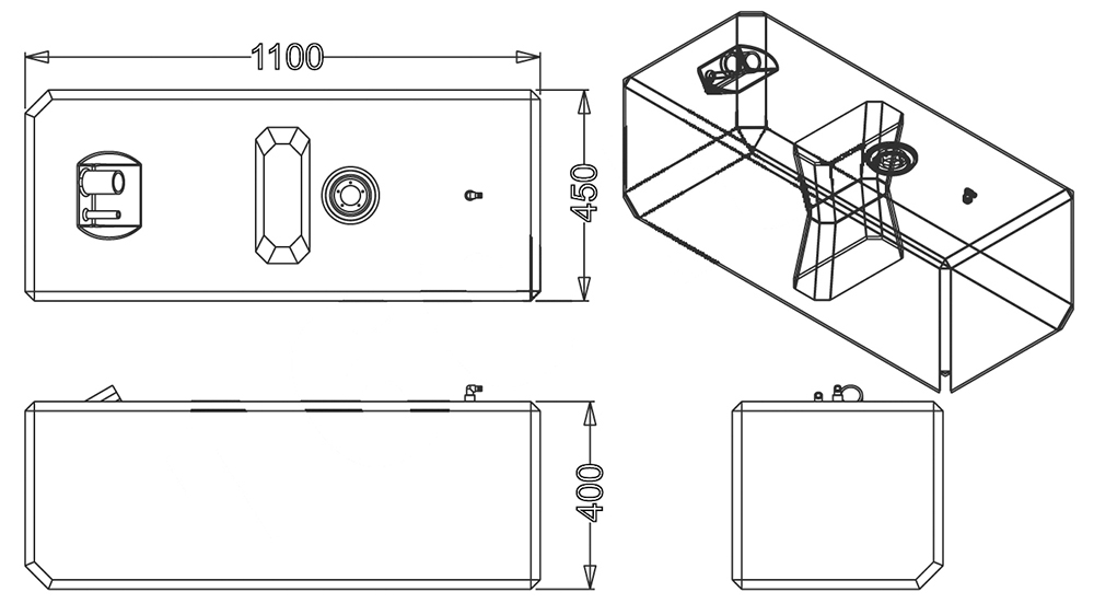 Starrer Kraftstofftank aus vernetztem Polyethylen mit neutraler Farbe, CE-zertifiziert gemäß Richtlinie 94/25 / EG gemäß Verordnung 10088 und ISO 21487. Ausgestattet mit Universal-Niveausensor 10-180 Ohm und 240-33 Ohm, Einsätze zum Einsteigen , Entlüftungs-Ø mm. 16, Saug- und Rücklauf Ø mm. 12. Jeder Tank wird einzeln getestet. Einstieg Ø40mm