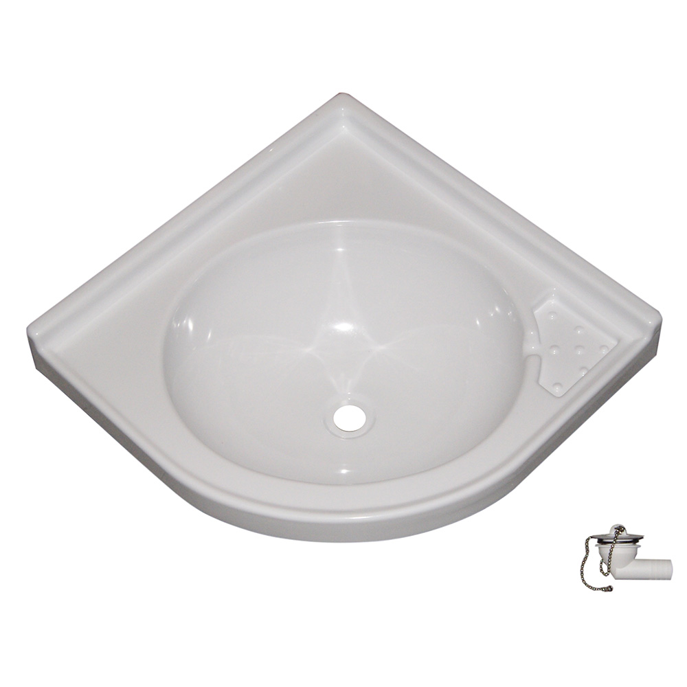 Eckwaschbecken aus weißem PVC für Badezimmer komplett mit Ablauf und Ablauf (art.2424030). Abm. Mm. 425x425x60h. Prof. mm. 130.