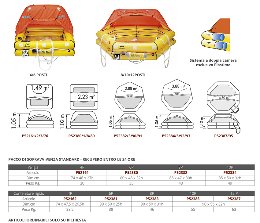 Entwickelt für die Navigation unter extremen Bedingungen, ISO9650-1 zertifiziert und in Klasse A katalogisiert (Aktivierung bei -15 ° C), ist es mit doppelt isoliertem Boden mit automatischem Öffnungsbogen und 4,3 cd Außenlicht gebaut. Es ist mit großen Auffangtaschen für Sicherheits- und Überlebensausrüstung, einem großen Schwimmanker und einer umkehrbaren Gewichtsleiter ausgestattet, die einen einfachen und bequemen Aufstieg aus dem Meer ermöglicht. Abhängig von der voraussichtlichen Zeit, die das Opfer auf dem Floß verbringen kann, um auf die Rettung zu warten, stehen zwei Arten von Überlebensausrüstung zur Verfügung: die Standardausrüstung, ohne Trinkwasser und Nahrung, wenn die Rettungskräfte innerhalb von 24 Stunden nach dem Aufenthalt auf See erwartet werden, dass Notfall, der auch Wasser und Nahrung umfasst, wenn Rettungskräfte über 24 Stunden auf See hinaus erwartet werden.