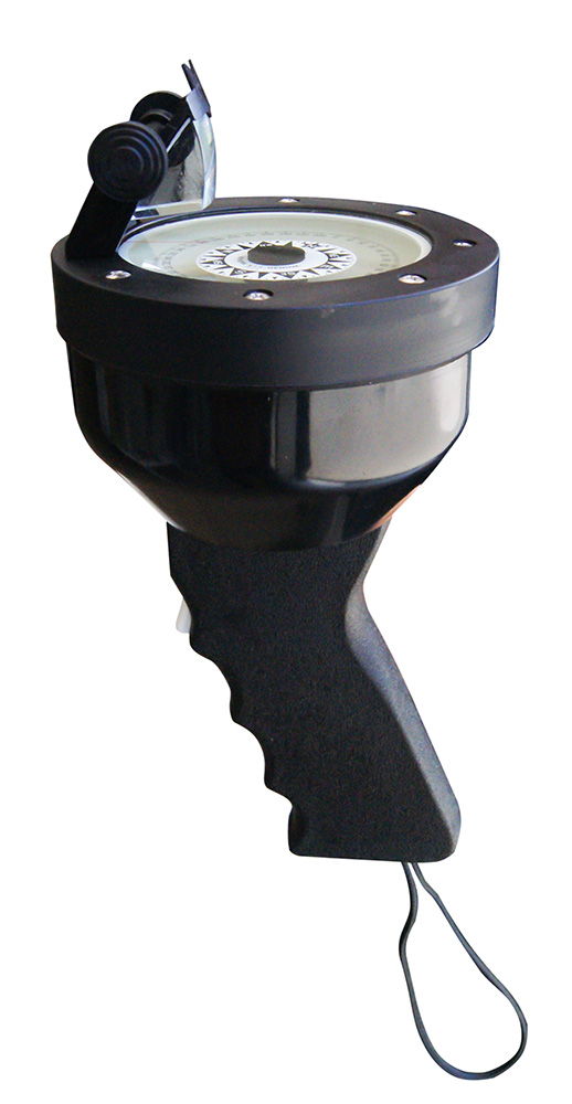 Peilkompass mit Prismenanzeige. Scheinbarer Ø 57,5 mm, Stiftaufhängung. Weiße Rose mit schwarzer Abstufung von 1°, Beleuchtung serienmäßig mit 1,5 V Batterie