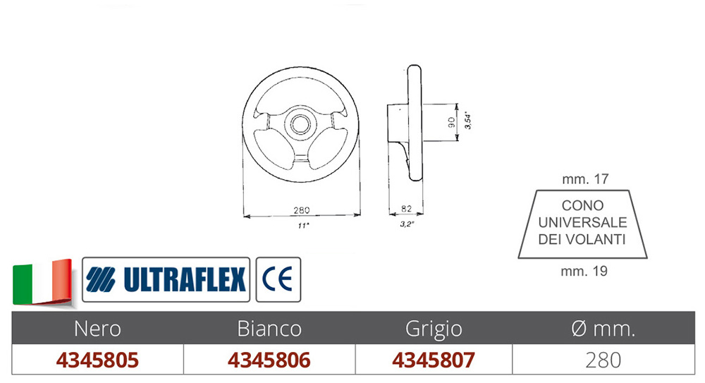3-Speichen-Lenkrad aus stoßfestem Thermoplast und weicher Polsterung. Ø 280 mm, Ausladung mm. 82, Universalkegel