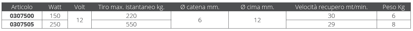 150W, 12V, Max. Sofortzug 220 Kg., Ketten-Ø mm. 6, oberer Ø mm. 12, Wiederherstellungsgeschwindigkeit 30 m / min, Gewicht 6 kg.